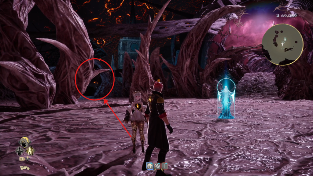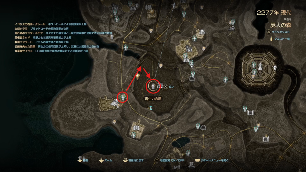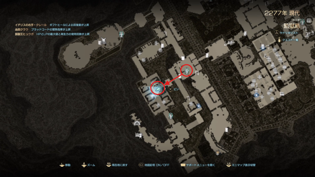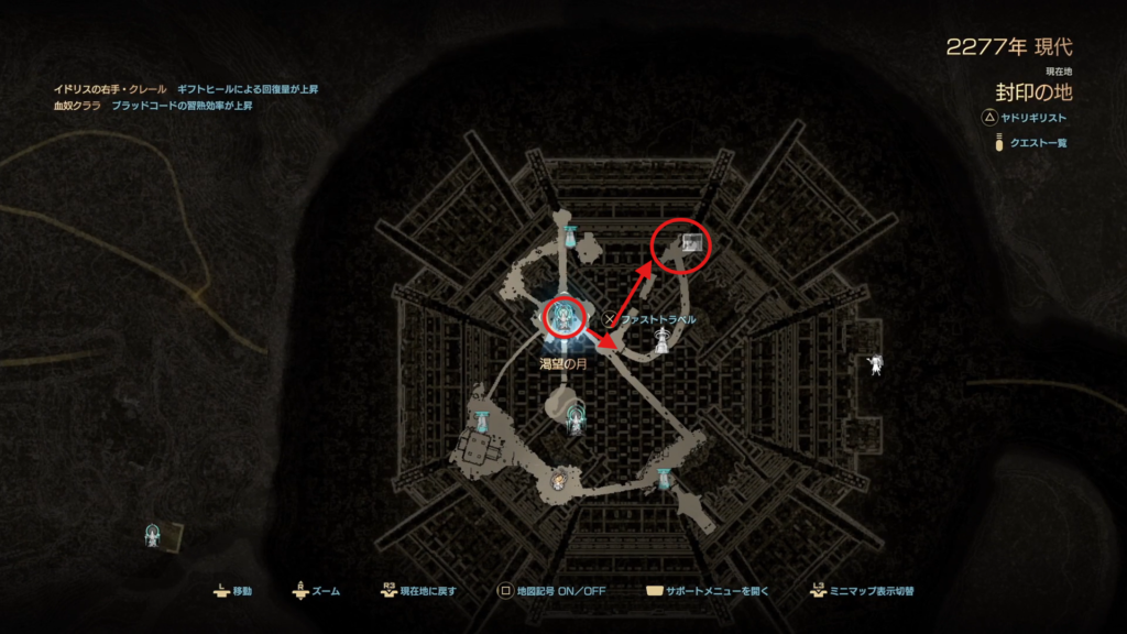 渇望の月のヤドリギから封印殻を正面に見て、左の道へ行くと、デカい敵がいるので、その横の道をバイクで滑空していけば着きます。