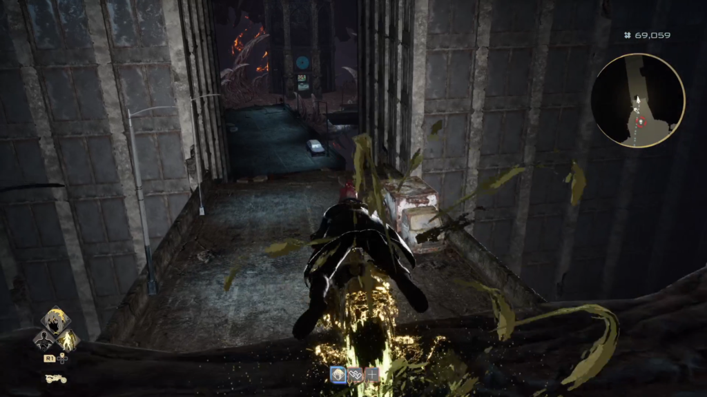 上の赤丸の建物の屋上に行き、バイクで架空して飛び移ります。